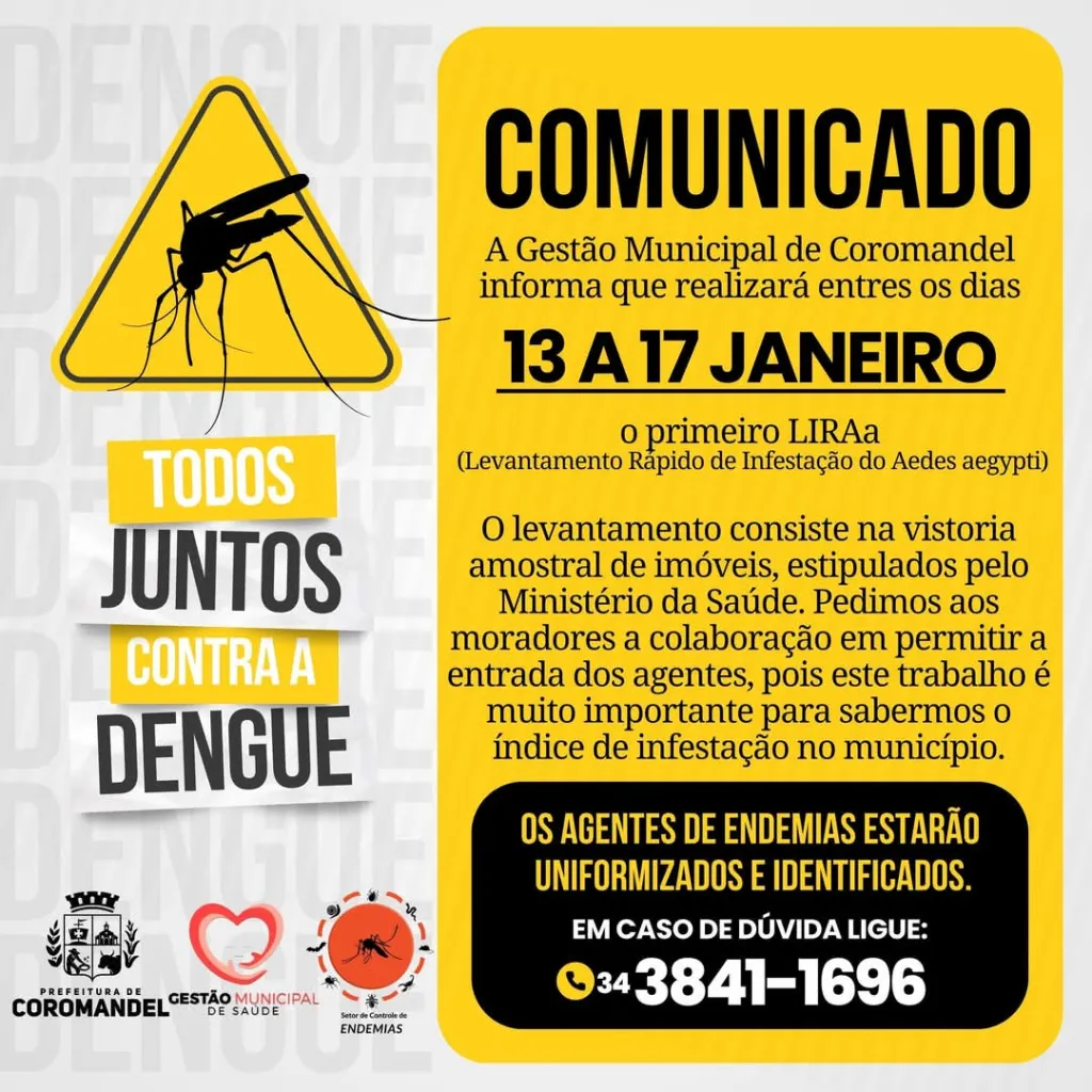 Com o aumento de chuvas e calor no início de 2025, Coromandel, reforça o combate à dengue para conter a proliferação do Aedes aegypti. O setor de endemias realiza mutirões de limpeza, elimina focos de água parada e promove campanhas educativas, destacando a importância da colaboração da população no descarte correto de resíduos.